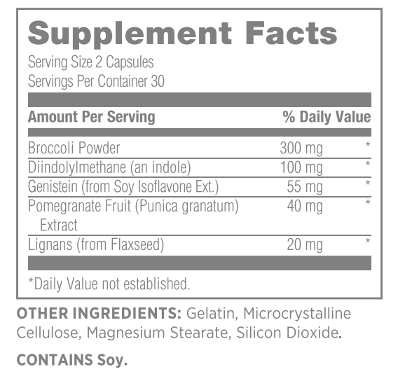 • Obsahuje zmes fytoestrogénov na ochranu citlivých tkanív a enzýmové induktory z prášku ľanových semien a DIM na podporu aktivity enzýmov v pečeni, čo pomáha udržiavať zdravý pomer estrogénových metabolitov.